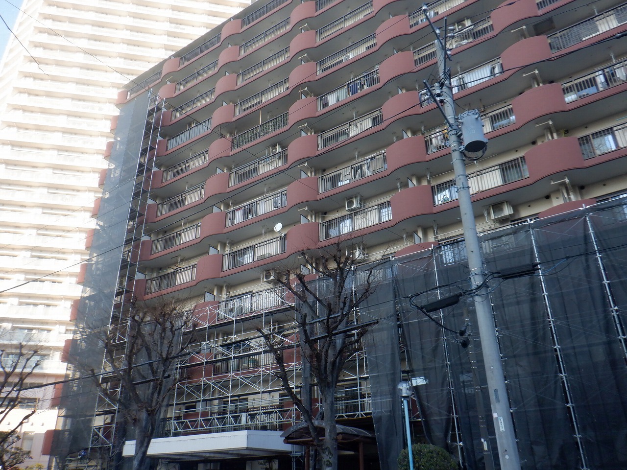 私が担当する都内のマンション大規模修繕工事が2月よりスタートしました。今回のマンションは3回目の大規模修繕工事ということもあり、居住者の皆様の中には工事に慣れている方も多くいらっしゃいますのでご期待に沿えるよう進めています。現在は外壁面に足場を組む工事をバルコニー面から行っており、組立が完了すると躯体の調査が開始となります。躯体調査は建物外壁のひび割れやモルタル欠損など機能回復を施さなければならない部分を確認し、その後補修作業を行います。工事は冬のピーク時に始まり夏本番の時期まで続きますので作業員一同事故・怪我の無いよう作業にあたります。
